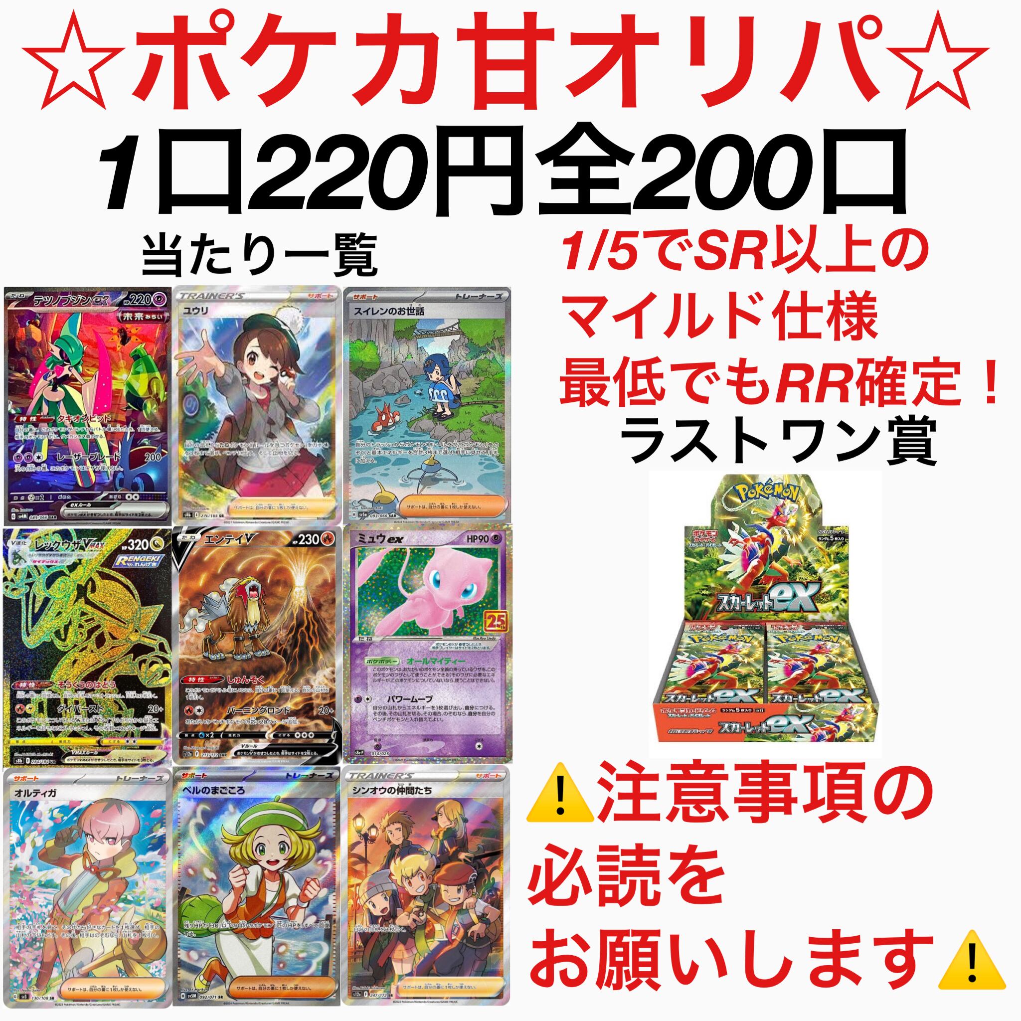 ☆1口1枚構成、最低でもRR以上、1/5でSR(HR、UR、SAR、CSR、SSR含む)が当たる!